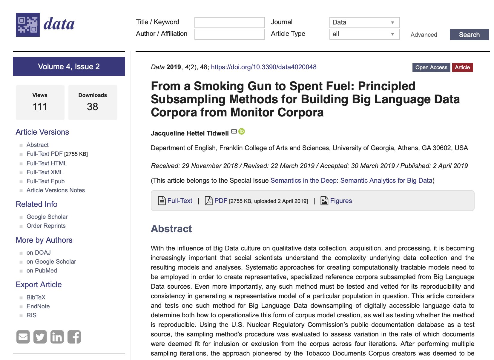 In this Open Access journal article, published in Data on April 2, 2019, I unpack how one method for principled subsampling approach to corpus creation can be used to transform Big Language resources (like Google) into usable models for understanding language behavior in domain-specific areas.